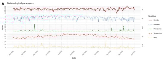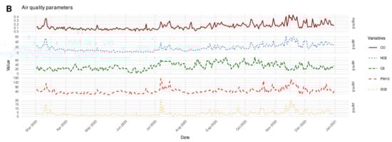 Time series distribution of meteorological (A) and air quality (B) parameters in Casablanca region (from 2 March 2020 to 31 December 2020).