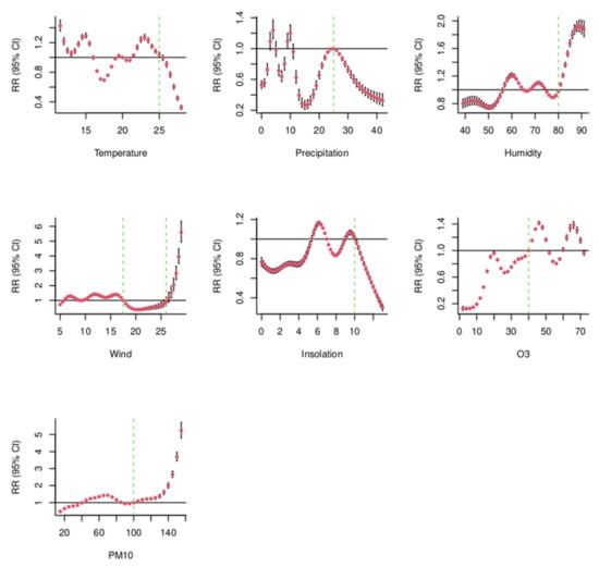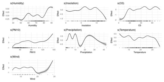 The GAMs model allows for a great flexibility in the estimation of the parameters because each covariate can have its own distribution. This helps to reduce the error terms and increase the precision of the model parameters estimation []. In this study, temperature, precipitation, humidity, wind, insolation, PM10 and O3 were adjusted as covariates. The general equation of our final model is as follows: