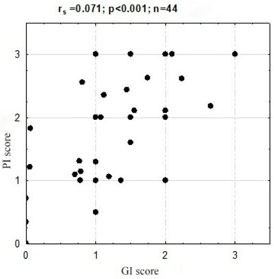 Spearman rank order correlation analysis showed a high correlation of PI and GI (rs = 0.071 p < 0.001) (Figure 2).