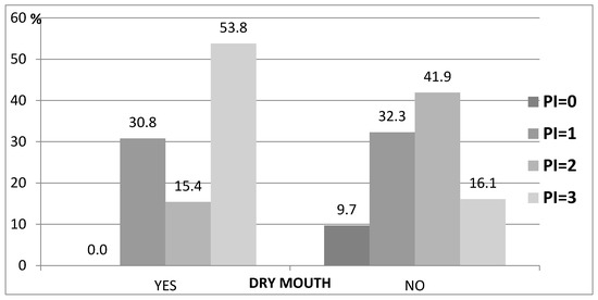 An analysis of the results of the questionnaire showed the presence of a relationship between PI, dry mouth and self-care. Among 53.8% of patients with dry mouth the PI value was 3, compared to patients who did not complain of dry mouth, where this result occurred in only 16.1% (p = 0.047) (Table 5, Figure 3).