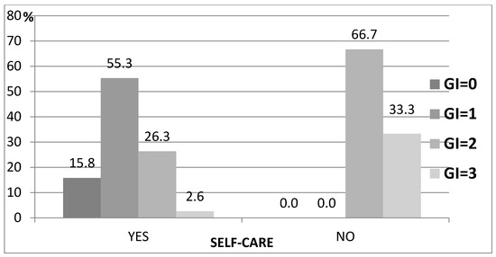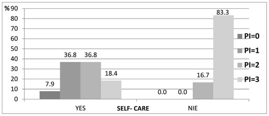 A significant influence of the ability to independently take care of proper oral hygiene on the value of PI and GI was found. Only 18.4% of the residents who performed their own hygiene activities had a PI = 3, while 83.3% of the dependents had a PI = 3 (p = 0.010) (Table 5, Figure 4).