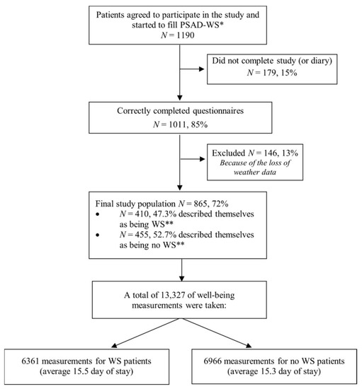 Flowchart of the study. * PSAD-WS, Palanga self-assessment diary for weather sensitivity; ** WS, weather sensitive.