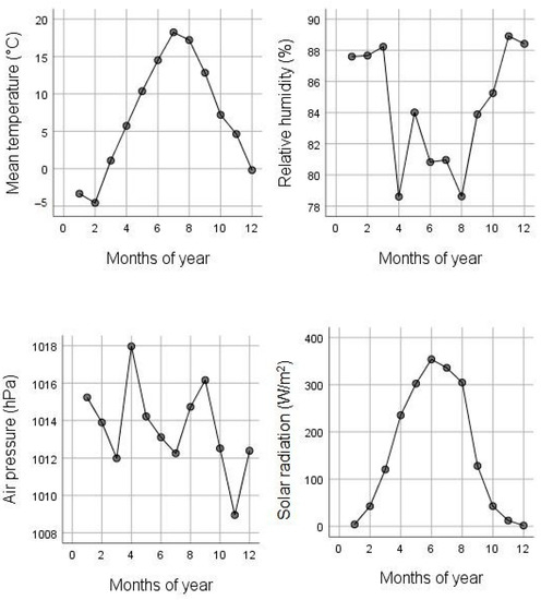 The mean value distributions of temperature, solar radiation, relative humidity, and barometric pressure, according to month, during the study period, are shown in Figure 2.