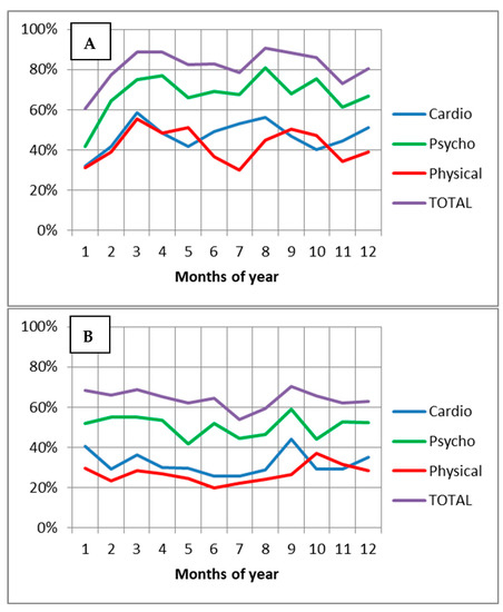 Percentages of measurements per month, of patients with CAD who reported one or more subjective well-being symptoms on the PSAD-WS total scale and symptom subscales: (A) Weather sensitive patients; (B) not weather sensitive patients.