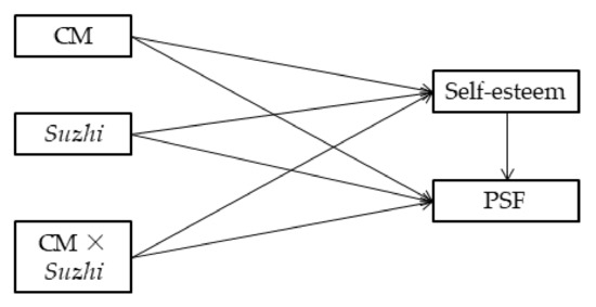 Evidence is also needed to support the moderating role of psychological suzhi in the relationship between childhood maltreatment and self-esteem. As a positive indicator of personal development, self-esteem is the core of mental health [25,26]. The negative impact of adverse environments on individual adaptation and development can be buffered by psychological suzhi [15]. Therefore, psychological suzhi should protect the development of self-esteem when an individual experiences childhood maltreatment. Taken together, we hypothesized that the moderating effect of psychological suzhi in the association between childhood maltreatment and psychosocial flourishing may be achieved through mediated variable self-esteem. Specifically, we assumed that the self-esteem of individuals with high psychological suzhi was less damaged by childhood maltreatment than those with low psychological suzhi, and self-esteem could significantly positively predict psychosocial flourishing.