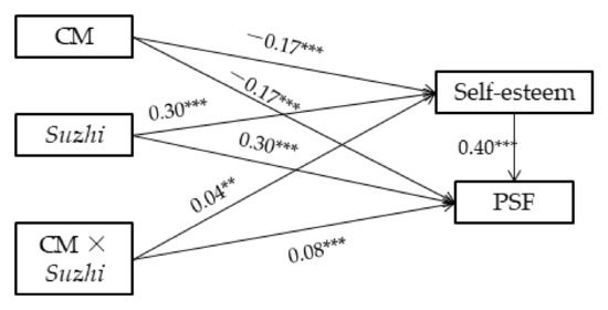 The regression coefficients of the mediated moderation model of the influence of childhood maltreatment on psychosocial flourishing. Note: CM = childhood maltreatment; Suzhi = psychological suzhi; PSF = psychosocial flourishing. ** p < 0.01. *** p < 0.001.