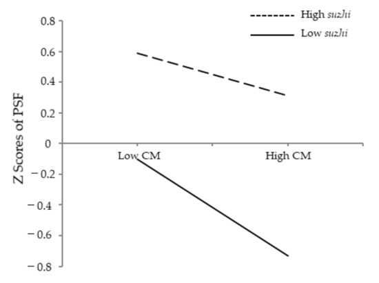 Psychological suzhi as a moderator of the relationship between childhood maltreatment and psychosocial flourishing. Note: CM = childhood maltreatment; suzhi = psychological suzhi; PSF = psychosocial flourishing.
