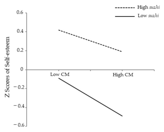 Psychological suzhi as a moderator of the relationship between childhood maltreatment and self-esteem. Note: CM = childhood maltreatment; suzhi = psychological suzhi.