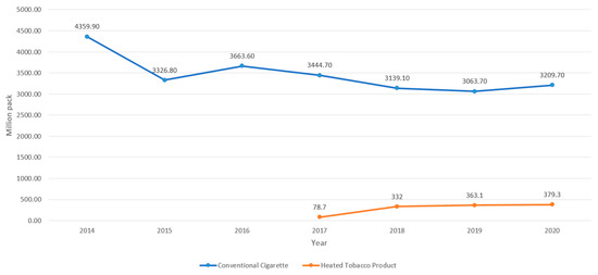 Figure 1 shows the sales of conventional cigarettes and HTPs in Korea from 2014 to 2020. The sales of conventional cigarettes decreased from 3663.60 million packs in 2016 to 3063.70 million packs in 2019; however, after the emergence of COVID-19 in 2020, it increased to 3209.70 million packs (4.77%). After an 80% tax increase on conventional cigarettes in 2015, the sale of conventional cigarettes decreased dramatically, and this continued until 2019, although there was rebound in the sale of conventional cigarettes between 2015 and 2016. HTPs were introduced in the Korean market in 2017, and the sale of HTPs increased rapidly from 78.7 million packs in 2017 to 332.0 million packs in 2018; the sales consistently increased in 2020.