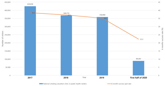 Figure 2 shows the number of participants and smoking cessation success rates for national smoking cessation services from 2017 to the first half of 2020. The number of smokers who visited national smoking cessation clinics in public health centers sharply decreased in the first half of 2020. In 2017, 424,636 smokers participated in smoking cessation clinics; however, in the first half of 2020, only 89,283 smokers visited clinics to quit smoking. In addition, the six-month success rate decreased from 38.5% in 2017 to 22.3% in the first half of 2020. Smokers who wanted to quit during the COVID-19 pandemic did not seek smoking cessation services, because such services were halted by the government. This resulted in a sharp decrease in the number of participants in smoking cessation services. In addition, the drop in the smoking cessation success rate from 38.5% in 2017 to 22.3% in early 2020 can be related to the COVID-19 pandemic. Since the pandemic, national smoking cessation services have only provided support by phone or through text messages, instead of conducting face-to-face consultations.