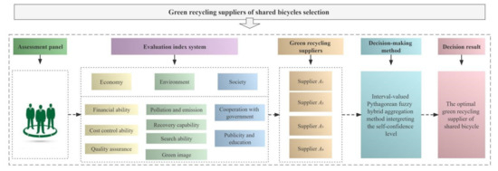 The evaluation index system of supplier selection previously only considered the importance of economic and environmental aspects, and several authors put forward several relevant selection methods on the basis of this index system [4,5,6]. In fact, the sustainable development of an enterprise should cover three dimensions: economy, environment, and society [7,8,9]. Obviously, the green recycling supplier selection of shared bicycles is a typical multiple attribute decision-making (MADM) problem involving various criteria and alternatives, which expresses the inhomogeneity in the following sides. Firstly, although the relevant research on the evaluation index system of green suppliers is relatively mature, few scholars systematically studied the evaluation index system of shared bicycle recycling service suppliers. Secondly, due to the complexity and uncertainty of the shared bicycle recycling operation mechanism, the evaluation information of the considered indicators is usually fuzzy and inaccurate. Third, in the existing literature, researchers rarely consider the confidence level of decision-makers (experts) in evaluation preference, while Liu et al. [10] pointed out that the level of confidence reflects the psychological behavior of decision-makers with different academic and professional backgrounds. Finally, the integration process of various criteria of the scheme has a decisive impact on the final choice in the process of MADM.