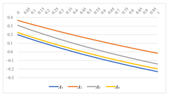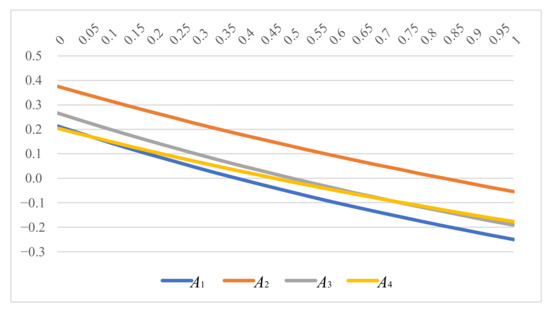 In Figure 2, the dynamic changing of the alternative rankings obtained by SC-IVPFHWAG operator due to different parameter values are shown. We preserve that the score values of the four alternatives decrease when the value of parameter increases, the overall dynamic changes are presented in an downward trend, but the score value decreasing speed of is less than and . Consequently, Figure 2 shows that the comprehensive ranking of increases gradually with the continuous increase in the value of parameter . In detail, when the parameter changes to 0.1, the score value of is higher than that of , and when parameter increases to 0.75, the score value of is higher than that of , and changes into the second ranking order while degenerates into the third ranking order. At this point, the arrangement of four academies tends to stable.