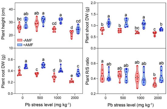 Plant height, shoot dry weight, root dry weight, and root/shoot (R/S) ratio of B. parviflora under different treatments. Dry weight (DW); Pb stress level (0, 500, 1000, and 2000 mg kg−1); non-mycorrhizal inoculation (−AMF); F. mosseae inoculation (+AMF). Data represent mean ± SD for biological replicates (n = 6). The same letter indicates no significant difference (Duncan’s test, p < 0.05).