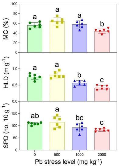 Mycorrhizal colonization (MC), spore density (SPD), and hyphal length density (HLD) of AMF under different Pb−stress levels (0, 500, 1000, and 2000 mg kg−1). Data represent mean ± SD for biological replicates (n = 6). The same letter indicates no significant difference (Duncan’s test, p < 0.05).