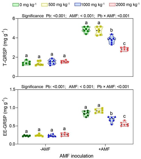 Total glomalin-related soil protein (T−-GRSP) and easily extractable glomalin-related soil protein (EE−GRSP) contents under different treatments. Non-AMF inoculation (−AMF); AMF inoculation (+AMF); Pb−stress level (0, 500, 1000, and 2000 mg kg−1). Data represent mean ± SD for biological replicates (n = 6). The same letter indicates no significant difference (Duncan’s test, p < 0.05).