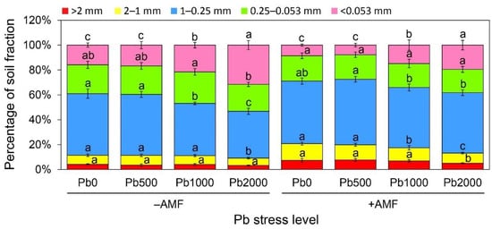 Soil-aggregate distribution under different treatments. Non-AMF inoculation (−AMF); AMF inoculation (+AMF); Pb stress level (0, 500, 1000, and 2000 mg kg−1). Data represent mean ± SD for biological replicates (n = 6). The same letter indicates no significant difference (Duncan’s test, p < 0.05).