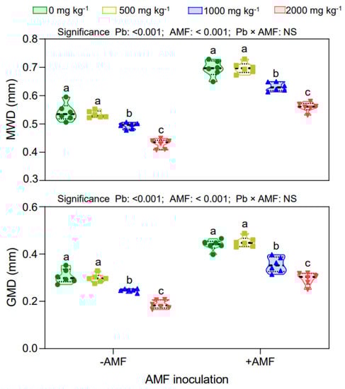The mean weight diameter (MWD) and the geometric mean diameter (GMD) under different treatments. Non–AMF inoculation (−AMF); AMF inoculation (+AMF); Pb stress level (0, 500, 1000, and 2000 mg kg−1). Data represent mean ± SD for biological replicates (n = 6). The same letter indicates no significant difference (Duncan’s test, p < 0.05).