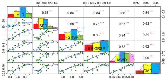Correlation matrix among the selected variables related to AMF growth parameters, GRSP content, and soil-aggregate stability. HLD, hyphal length density; SPD, spore density; T-GRSP, total glomalin-related soil protein; EE-GRSP, easily extractable glomalin-related soil protein; MWD, mean weight diameter; GMD, geometric mean diameter (*** p < 0.001; ** p < 0.01).