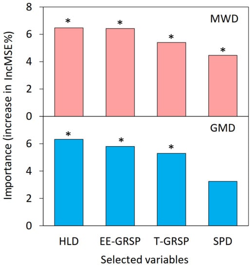 Random forest variable importance plot. The variables are ranked in order of relevance in predicting soil aggregate stability (MWD and GMD). The importance measure considered for the analysis is the mean decrease in accuracy computed via random forest classification algorithm. HLD, hyphal length density; SPD, spore density; T-GRSP, total glomalin-related soil protein; EE-GRSP, easily extractable glomalin-related soil protein (* p < 0.05).