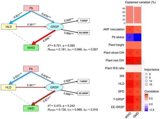 Prior to statistical analysis, the Kolmogorov–Smirnov test and the Levene test were applied to assess data normality and homogeneity, respectively, using SPSS 21.0. for Windows 10 (SPSS Inc., Chicago, IL, USA). Subsequently, one-way ANOVA was used to assess the significant differences in HLD, SPD, T-GRSP, EE-GRSP, mass percentage of soil particles, MWD, and GMD among different treatments, whereas two-way ANOVA was performed to reveal the interactive effects of Pb stress and AMF inoculation on T-GRSP, EE-GRSP, MWD, and GMD. Pearson’s correlation analysis was used to explore the strength of relationships among HLD, SPD, T-GRSP, EE-GRSP, mass percentage of soil particles, MWD, and GMD. The random forest model was performed to clarify the main factors affecting the stability of soil aggregates using the randomForest function from the randomForest package in R-4.1.1 version []. The pathways of Pb pollution affecting the stability of soil aggregates were revealed based on the structural equation model analysis using lavaan package in R-4.1.1 version [].