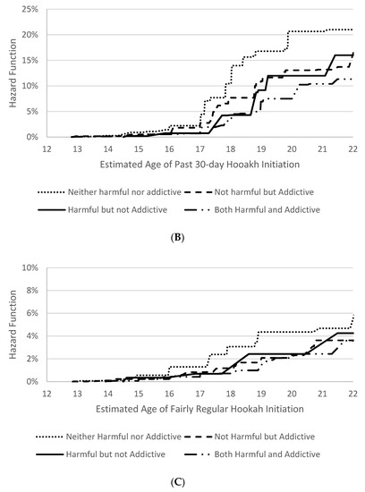 4. Pérez, A.; Kuk, A.E.; Bluestein, M.A.; Harrell, M.B.; Perry, C.L.; Chen, B. Prospective estimation of the age of initiation of hookah use among youth: Findings from the Population Assessment of Tobacco and Health (PATH) study waves 1–4 (2013–2017). Addict. Behav. 2021, 117, 106838. [Google Scholar] [CrossRef] [PubMed]