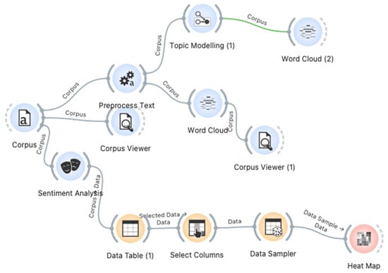 These methods were implemented in the following manner: (1) Two separate corpora of documents were constructed (based on scientific articles and expert opinion columns). (2) The text of each corpus was preprocessed by the preprocess tool to filter white spaces and punctuation. (3) Topic modeling and word cloud components were adjusted to each clean corpus element. In addition, the sentiment analysis component was used to evaluate whether the text contained negative, positive, or neutral attitudes, and the heat map component was used to support it with visualization attribute values.