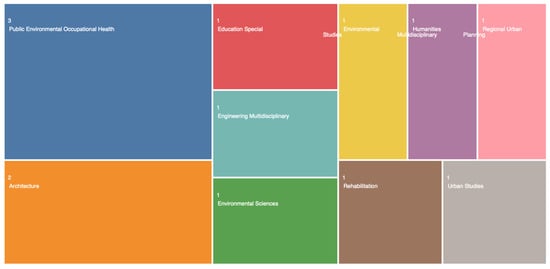 The documents’ distribution for the 1995–2022 period revealed a consistent trend in the number of citations dealing with autism and environmental design when “Autism”, “Environment”, and “Design” were used as separate words (Figure 2). However, in the years 2016–2022, specific articles in the domain of autism and workplace design and/or built design became more prominent. Hence, when the search was conducted with the words “Autism” and “Environmental Design”, a total of 364 publications with 11,739 citations and 41.17 average citations per item was obtained. After excluding the irrelevant papers from the obtained repository and refining the search using the sentences “Architecture for Autism” and/or “Built Environment”, only 10 papers for the period of 2016–2022 remained (Table 2). These papers had 31 citations with 3.1 average citations per item. The data visualization report showed that these 10 papers were affiliated with the following domains: the domain of Public Environmental Occupational Health included 3 papers; the domain of Architecture contained 2 papers; and the domains of Environmental Studies, Special Education (provided by WoS as Education Special), Engineering–Multidisciplinary, Environmental Sciences, Humanities–Multidisciplinary, Regional Urban Planning, Urban Studies, and Rehabilitation comprised 1 paper each (Figure 3). It should be noted that some of these 10 papers belonged to more than one domain. An evaluation of the papers’ titles showed that they dealt with the topics of inclusive space design, acoustical design, friendly and non-noisy workspaces, and lighting conditions. A scoping review following Tola et al. [], supported by the other papers, showed that acoustic, smell, noise, and light stimuli, along with adequate visualization and friendly environmental design, were viewed as the main factors to be taken into consideration in the architectural design of workplaces for people with ASD. In addition, the article by Sheppard-Jones et al. [] provides guiding principles of universal design for vocational rehabilitation that facilitate the fulfillment of the needs of people with ASD on the march toward more productive workplaces. Moreover, universal design was mentioned as an important factor used to support students with ASD to engage with other students and acquire sufficient training, social skills, and readiness for the job market [].