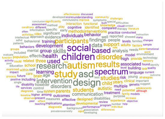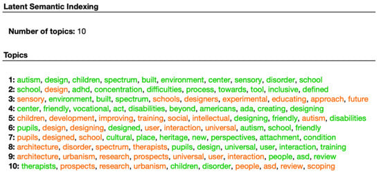 Figure 5 and Figure 6 show the scientific literature and the experts’ discourse on the importance of environmental design for people with ASD and its contribution to their quality of life and integration into society. Both the scientific and the experts’ papers mention the importance of “adaptive” designs that may improve the quality of life of people with ASD and especially their integration into workplaces. For example, words such as “Building, “Urbanisms”, “Future Architecture”, “Sensory”, “Improving”, “Spaces”, “Design”, and “Intervention” are frequently found in these word clouds, which points to their importance. Overall, the word cloud diagram shows that while scientific documents focus mainly on the theoretical impact of environmental design (derived from the words “Autism”, “Results”, “Study”, “Training”, “Conclusions”, “Methods”, and “Research”, which are prominent in the scientific papers’ word cloud distribution (Figure 5), experts’ documents focus mostly on the implementation of adapted and effective architectural designs for people with ASD as part of an intervention programs aimed to integrate them into workplaces (as seen, for example, in the words “Design”, “Spaces”, “Friendly”, and “Sensory”, which are prominent in these articles’ word cloud distribution (Figure 6)). Moreover, topic modeling shows that the design of sensory and urban environments may improve the adaptation of people with ASD to their workplace surroundings. They are also important in mitigating the communication difficulties of persons with ASD and contribute to their future development as self-reliant individuals. These findings can be inferred from words such as “Sensory”, “Interaction”, “Architecture”, “Urbanism”, “Universal”, and “Autism”, which are prominent in the expert opinion corpus (Figure 7). Lastly, sentiment analysis and heat map components point to a positive attitude on the part of architectural experts regarding the adjustment of workplace design to people with ASD.