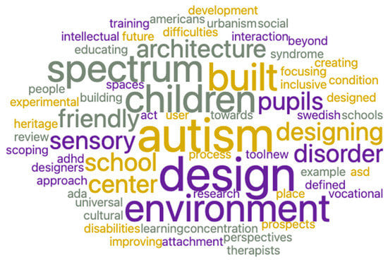 The papers’ titles were searched for topics using keywords suggested by Sardi et al. []: “Architecture” and/or “Design” and/or “Environmental Design” and/or “Built Environment” and/or “Working Places” and/or “Working Environments” and/or “Autism” and/or “Autistic People” and/or “for Autism”. In addition, since the concept of universal design is also common in special education architecture, the following keywords were searched together: “Universal Design”, “Autism”, and “Workplace”. The experts’ articles were searched through the GoogleTM search engine, where the following words were used: “Architecture” and/or “Design” and/or “Environmental Design” and/or “Autism” and/or “Autism People”.
