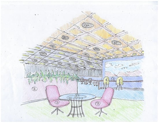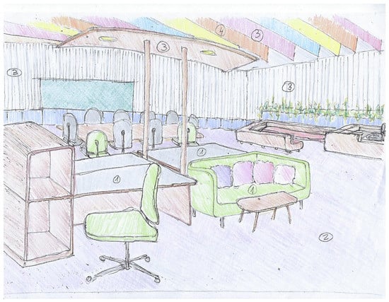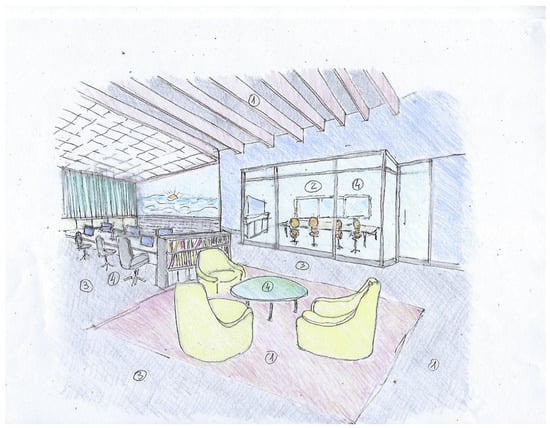 The results of the text analysis of scientific and expert opinion documents as well as the word cloud analysis show that people with ASD need a friendly climate that takes into consideration sensory stimuli and communication difficulties []. The adapted environmental design is intended to help them engage with other employees and maximize their productivity. Examples of architectural design sketches of appropriate work environments adapted specifically, but not uniquely, to individuals with ASD are shown in Figure 8, Figure 9, Figure 10 and Figure 11 (all sketches were drawn by one of the authors). These sketches demonstrate several solutions regarding the proper spatial planning and avoidance of sensory disturbances that are expected to contribute to create an ASD-friendly workplace. Figure 8 illustrates a design that includes relaxation spaces, acoustic ceilings and carpets, visual clearance, clear and simple circulation paths, and different well-defined work and rest areas. Figure 9 portrays the design of a friendly personal workspace within a wider open-space arrangement that incorporates natural and artificial lighting and acoustic panels. Figure 10 shows a design that comprises intimate spaces with artificial ventilation and air conditioning, non-fragrant vegetation in open partitions, and various peaceful colors defining different areas. Figure 11 shows a design that includes controlled daylight, walls with images of pastoral views, and furniture arrangements that create a homey atmosphere.