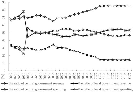 Land finance originated from the gap between local fiscal revenues and expenditures caused by the tax-sharing reforms of 1993. In recent years, the proportions of local governments’ fiscal revenues have been slightly higher than those of the central government, but local fiscal expenditures have been increasing and significantly exceeding the spending by the central government (Figure 2), resulting in higher local fiscal deficits. Under pressure from the GDP Competition Championship and fiscal deficits, local governments have actively been seeking new sources of finance, such as land fiscal revenues, within the legal tax system. Local governments have become over reliant on these sources [,,]. A clear distinction should be made between land fiscal revenue and land finance. Land fiscal revenue already exists when there is land tax. Land finance refers to land-related income, which includes land-transfer revenues, land-related taxes, and land mortgages. Measurement indicators of land finance are usually divided into the following two categories: one is the total income derived from land-transfer revenues, land taxes, and land mortgages [,]; and the other is determined by relative scales.