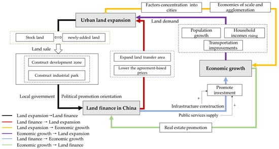 In this study, a conceptual framework was constructed to study the relationships among urban land expansion, land finance, and economic growth (Figure 3).