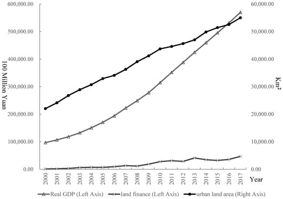 Real GDP, land finance, and urban land construction area from 2000–2017 in China.