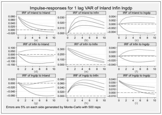 A Granger causality Test revealed that lnland and lnfin could explain the changes in lngdp to some extent, but not vice versa. Land finance was one of the Granger causes of urban land expansion at the 1% significance level. Furthermore, the interactions among urban land expansion, land finance, and economic growth in China constitute a dynamic impulse process. The variance decomposition showed downward trends in the explanatory powers of lnland, lnfin, and lngdp for themselves. Moreover, the explanatory power of lnland for lnfin increased from 0.20% to 1.90%. In contrast, changes in lngdp made the lowest contributions to changes in lnland and lnfin. In terms of the explanatory power of each impulse variable for lngdp, lnfin made the highest contribution to changes in lngdp, whose average contribution rate was 65.26%.