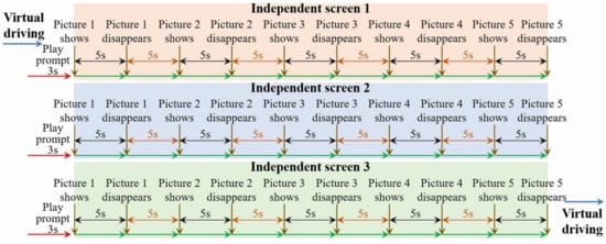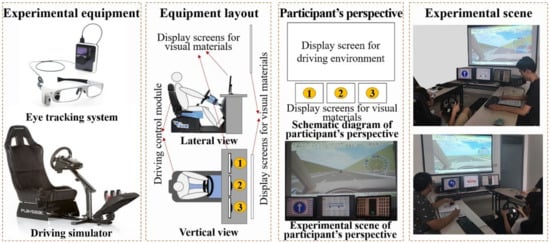 The experiment referred to collecting the visual attention data of the participants when they respond to different visual cognitive tasks in virtual driving through the eye-tracking system. In the experiment, the participants were required to choose any lane to drive in the virtual road environment at a speed of 80 km/h to 120 km/h on a driving simulator. The virtual driving environment was set as a two-way four-lane highway, and the single-lane traffic flow was set at 300 pcu/h. The driving simulator included a driving control module and an environment display module. The participants manipulated the vehicle through the control module, and the environment display module displayed the corresponding environmental visualization information dynamically. Three independent screens for playing visual cognitive materials were set between the driving control module and the environment display module. The participants were required to complete the visual cognitive tasks in the shortest possible time while completing driving tasks (maintaining speed and not violating traffic rules), and their visual attention data were captured and recorded by the eye-tracking system. The design idea of visual attention characteristic data collection is shown in Figure 1.