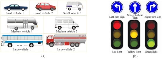 Visual cognitive materials: (a) Schematic diagram of vehicle types; (b) Schematic diagram of traffic signs and traffic lights.
