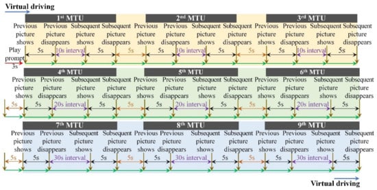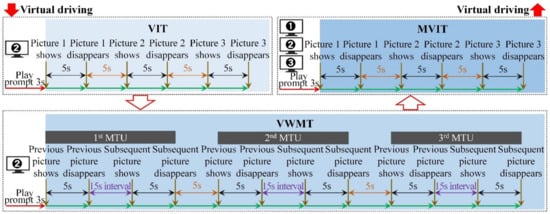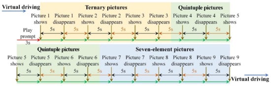 Visual cognitive tasks included the Visual Identification Task (VIT), Visual Working Memory Task (VWMT) and Multiple Visual Identification Task (MVIT). The VIT was to examine visual attention time and identification accuracy when faced with a single cognitive object of varying information capacity. The VWMT was to examine visual attention time and identification accuracy when faced with a single cognitive object of varying information capacity. The MVIT was to examine visual attention allocation characteristics and identification accuracy when faced with multiple cognitive objects. In the VIT, the visual cognitive materials were static pictures randomly combined with the diagrams of different types of vehicles (Figure 2a). Each vehicle diagram contained in the visual perception picture was defined as a basic information unit, and the pictures containing 3, 5 and 7 basic information units were defined as ternary pictures, quintuple pictures and seven-element pictures, respectively. The VWMT included Visual Identification and Memory Task (VIMT) and Visual Identification and Recall Task (VIRT). A VIMT and a VIRT constituted a Memory Task Unit (MTU). In the VWMT, the visual cognitive materials were all seven-element pictures composed of vehicle diagrams. In the MVIT, the visual cognitive materials were played simultaneously on the three independent screens, and the content played on each screen was a schematic diagram of a traffic sign, a signal light or a vehicle mode in Figure 2, respectively. Each traffic sign or signal light schematic included in the picture was also identified as a basic information unit, and the visual materials played in the MVIT were all unary information pictures. The materials played on the three screens at one time were a random combination of a traffic sign, a signal light and a vehicle model diagram, and the content attributes of the pictures played on each screen are different (that is, when the traffic signs were played on screen 1, the other two screens will no longer select the traffic signs, and so on).