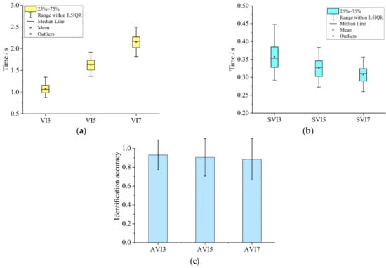 Figure 7 shows the fixation time and identification accuracy of the participants in the VIT for multi-information pictures. As shown in Figure 7a, as the number of the basic information units in the picture increases, the fixation time increases synchronously. The statistical results showed that the value range of VI3 was 0.875~1.343 s (M = 1.072, SD = 0.117), the value range of VI5 was 1.362~1.919 s (M = 1.624, SD = 0.143) and the value range of VI7 was 1.819~2.500 s (M = 2.153, SD = 0.161). As shown in Figure 7b, with the increase in the number of basic information units in the picture, participants’ fixation time to a single basic information unit decreased. The statistical results showed that the value range of SVI3 was 0.292~0.448 s (M = 0.357, SD = 0.039), the value range of SVI5 was 0.272~0.384 s (M = 0.325, SD = 0.029) and the value range was 0.260~0.357 s (M = 0.308, SD = 0.023). Figure 7c showed the average identification accuracy for different pictures (AVI3, AVI5 and AVI7) in the VIT. The statistical results showed that the value range of the identification accuracy rates was 0.333~1. Among them, AVI3, AVI5 and AVI7 were 0.930 (SD = 0.159), 0.905 (SD = 0.199) and 0.886 (SD = 0.221), respectively.