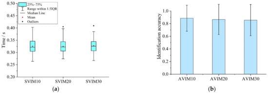 The visual materials in the VIMT were all seven-element pictures. Figure 8a shows the participants’ fixation time (SVIM) for a single basic information unit in the VIMT. The statistical results showed that the range of SVIM10 was 0.264~0.403 s (M = 0.325, SD = 0.028), the range of SVIM20 was 0.264~0.403 s (M = 0.325, SD = 0.027) and the range of SVIM30 was 0.267~0.409 s (M = 0.328, SD = 0.028). The results of one-way ANOVA on SVIM (Table 6) showed that there was no significant difference among SVIM10, SVIM20 and SVIM30.
