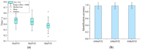 Figure 10b shows the identification accuracy of visual materials in the MVIT(AMulVI). The AMulVI1, AMulVI2 and AMulVI3 were 0.976 (SD = 0.096), 0.976 (SD = 0.096) and 0.982 (SD = 0.090), respectively. The one-way ANOVA (Table 20) showed there was no significant difference among AMulVI1, AMulVI2 and AMulVI3 (F = 0.090).