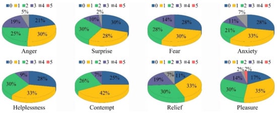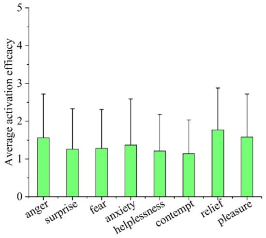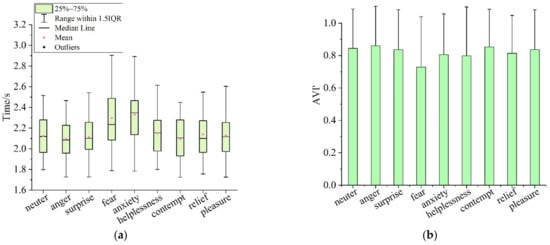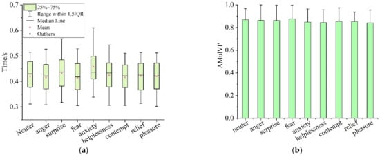 Figure 16 shows the visual attention characteristics of participants with different emotions in the MVIT. Figure 16a,b were the fixation time (MulVI’) and identification accuracy (AMulVI’) to the visual materials, severally. According to statistics, the average fixation time of participants in the states of neuter, anger, surprise, fear, anxiety, helplessness, contempt, relief and pleasure to unary pictures was 0.420 s (SD = 0.058), 0.416 s (SD = 0.058), 0.433 s (SD = 0.064), 0.414 s (SD = 0.058), 0.458 s (SD = 0.069), 0.424 s (SD = 0.060), 0.416 s (SD = 0.056), 0.422 s (SD = 0.059) and 0.420 s (SD = 0.057), severally, and the average identification accuracy of unary pictures was 0.868 (SD = 0.098), 0.863 (SD = 0.137), 0.860 (SD = 0.137), 0.876 (SD = 0.122), 0.848 (SD = 0.116), 0.842 (SD = 0.114), 0.853 (SD = 0.120), 0.853 (SD = 0.083) and 0.840 (SD = 0.115), respectively.