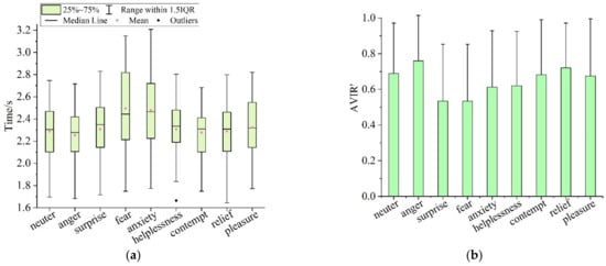 Figure 15 shows the visual attention characteristics of participants with different emotions in the VWMT. Figure 15a,b were the fixation time (VIR’) and identification accuracy (AVIR’) to visual materials, severally. According to statistics, the average fixation time of the participants in the states of neuter, anger, surprise, fear, anxiety, helplessness, contempt, relief and pleasure to subsequent pictures was 2.288 s (SD = 0.252), 2.252 s (SD= 0.244), 2.307 s (SD = 0.259), 2.494 s (SD = 0.351), 2.479 s (SD = 0.329), 2.306 s (SD = 0.253), 2.279 s (SD = 0.237), 2.289 s (SD = 0.253) and 2.324 s (SD = 0.260), and the average identification accuracy of subsequent pictures was 0.690 (SD = 0.285), 0.760 (SD = 0.255), 0.535 (SD = 0.318), 0.535 (SD = 0.318), 0.612 (SD = 0.316), 0.620 (SD = 0.305), 0.682 (SD = 0.308), 0.721 (SD = 0.251) and 0.674 (SD = 0.321).