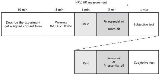 The experimental procedure is illustrated in Figure 1. Upon arriving in the experiment room, participants voluntarily completed the consent form after hearing the purpose and procedure of the experiment and before starting the experiments. After the instrument for measuring physiological responses was attached, participants sat in a chair for 5 min. Participants closed their eyes and rested for 1 min, followed by exposure to fir essential oil or room air for 3 min. After olfactory stimulation, participants opened their eyes and conducted a subjective evaluation for 3 min. This study adopted a within-subject experimental design. Physiological and psychological responses were compared when the same participant inhaled fir essential oil or room air. To eliminate the influence of order, approximately half of the participants were administered stimulation in the following order: exposure to fir essential oil, followed by room air (control). The remaining participants were administered the control, followed by the fir essential oil.