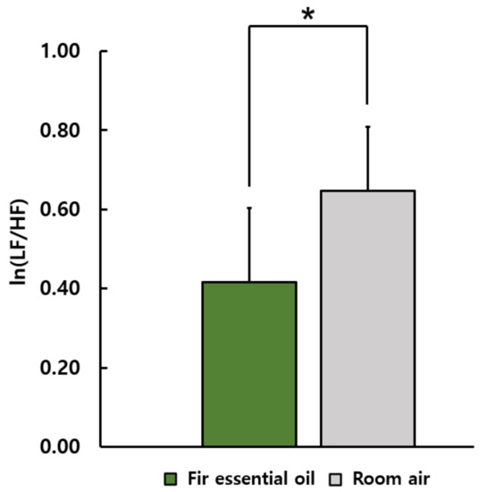 The ln(LF/HF) values of heart rate variability during the inhaling fir essential oil and room air. N = 20, mean ± standard error, * p < 0.05 by paired t-test (one-sided).
