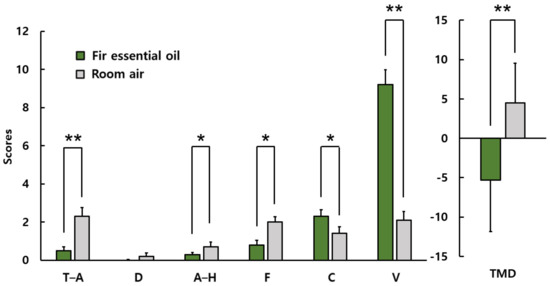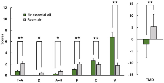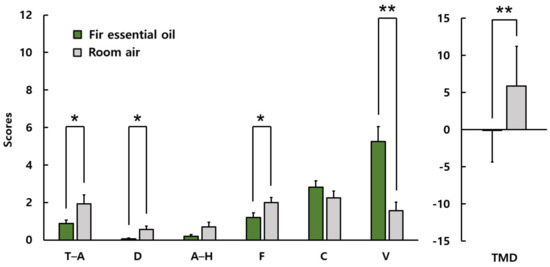POMS scores after inhaling fir essential oil and room air. T–A: tension–anxiety; D: depression; A–H: anger–hostility; F: fatigue; C: confusion; V: vigor; TMD: Total Mood Disturbance N = 26, mean ± standard deviation, ** p < 0.01, * p < 0.05 by Wilcoxon singed-rank test (one-sided).