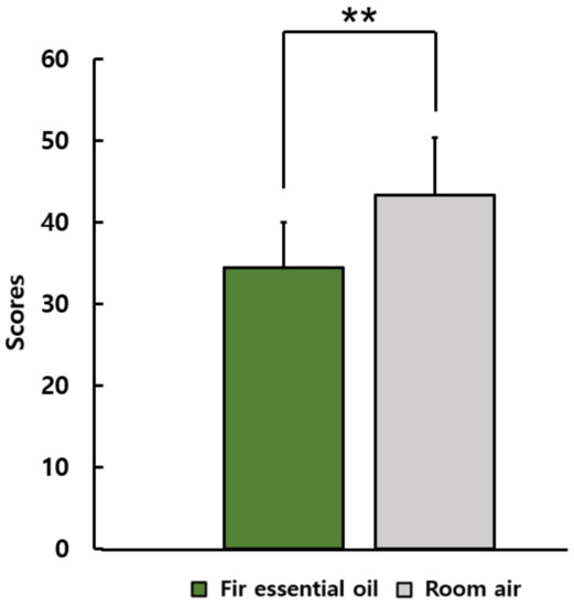The state anxiety scores of the State-Trait Anxiety Inventory questionnaire after inhaling fir essential oil and room air N = 26, mean ± standard deviation, ** p < 0.01 by Wilcoxon singed-rank test (one-sided).