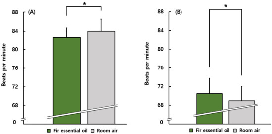 Figure 6 shows the results of the comparison between the heart rate of female and male students. Among the female group, the heart rate during stimulation using fir essential oil (82.5 ± 2.2 bpm) was significantly lower than that during the control condition (84.0 ± 2.5 bpm). However, among the male group, the opposite was observed. Their heart rate during olfactory stimulation (70.5 ± 3.3 bpm) was significantly higher than that during the control condition (68.9 ± 3.2 bpm).
