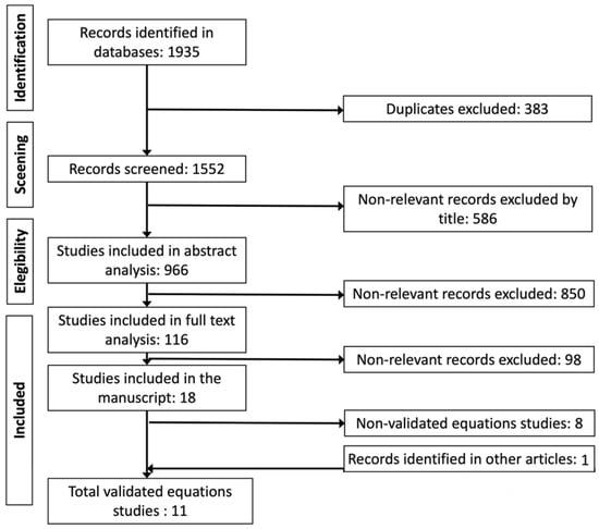 The regression model, parameters, statistics, and methodology for the used validation model were extracted from each eligible manuscript. The multi-objective optimization method [,] was used to analyze the validity and reliability of the equations in the full-text manuscripts published; drawing up a list of published criteria to validate multiple linear regression (Table 2). Primary attention was paid to the collection of the models, the prediction errors, and the adjustment values: adjusted R2, R2, standard error of estimation (SEE), and pure error (EP), among others. The model with the highest prediction fit, the highest prediction and concordance coefficients, and the lowest prediction errors were followed if a manuscript proposed several similar estimation equations. In addition, when the difference between the regression coefficients and prediction errors was less than 1%, the model with the least number of independent variables or regressors was selected, a method known as the principle of parsimony.