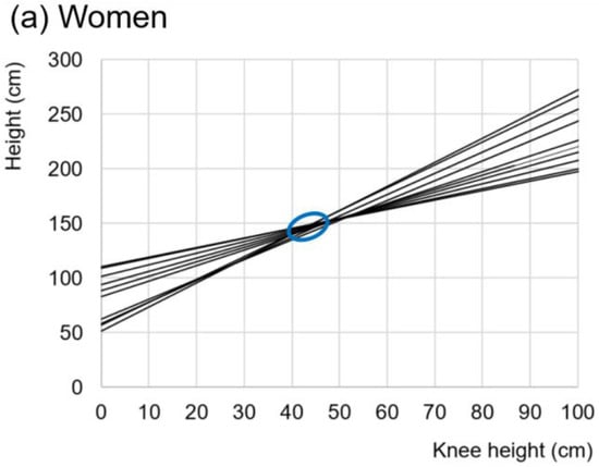 To date, we have various equations (eqs) to calculate the maximum height in older adults from accessible anthropometric variables; however, many of them lack validity and reliability or are compromised to different degrees by methodological errors and inappropriate statistical treatments of the data [,,]. For example, Lima et al. [], in a sample of 168 participants over 60 years of age, compared the adequacy of 23 published equations to calculate the maximum height in the Brazilian population. Some of these equations had prediction errors between 9 cm and 12 cm. Due to the abovementioned problems, only twelve were adjusted adequately and useful as prediction models in men (R2 and ICC ≥ 0.7) but not in women. On the other hand, a strange and reduced systematic review [] mentioned having analyzed 20 manuscripts concerning the association of height with various anthropometric variables, including arm span, KH, sitting height, forearm length, demi span, bi-axillary length, humeral length, hand length, thigh length, foot length, weight, standing height, half arm span, and leg length. They concluded that arm span was the most reliable anthropometric length to determine height; however, the authors did not present the respective studies and analyses or evidence to support their conclusions.