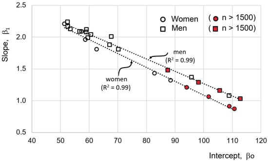where y is the size of one of the organism’s parts, x is the total size of the organism, and b and α are constants. The constant b is a scaling factor that expresses the differences in size between comparable organisms (of the same shape) with the same α. The constant α is the ratio of specific growth rates of y/x. It is important to note that this model tries to explain the ontogenetic process of growth and not precisely estimate the size of the organism’s entire body based on the size of any of its parts. Another important aspect is the dynamic conception of allometric relationships, where the constant α in the equation refers to the concept of “constant differential growth ratio,” and not to the relationship between a part of the body and its total size, but to a ratio between two or more variables to determine growth-rates (y = βo + β1x1α1 + β2x2α2 + … + βnxnαn + , where for lineal regression α = 1). This model emphasizes understanding species’ evolution, supporting the hypothesis that proportionate “dwarf” and “giant” species often owe their status to changes in a single gene that controls simple hormonal mechanisms. This model has also made it possible to establish the concept of allometric rearrangements (different b and same α) and to propose that these can result from simple mutations []. Thus, the models presented in Figure 2 and Figure 3 can be interpreted under the inspiration of the light that the “power law” can illuminate. For example, return to the concept of allometric transposition. Sexual dimorphism in humans has been the subject of various studies; for example, dimorphism in pelvic height-width ratio and iliac blade orientation was found to be mediated by a growth hormone (GH) secreted at puberty by females []. In this way, as already mentioned, sexual dysmorphism is not only in a weight-mass relationship, but there are also allometric differences between other body parts which makes it necessary to analyze women and men separately in the construction of the anthropometrics equations to predict maximum height.